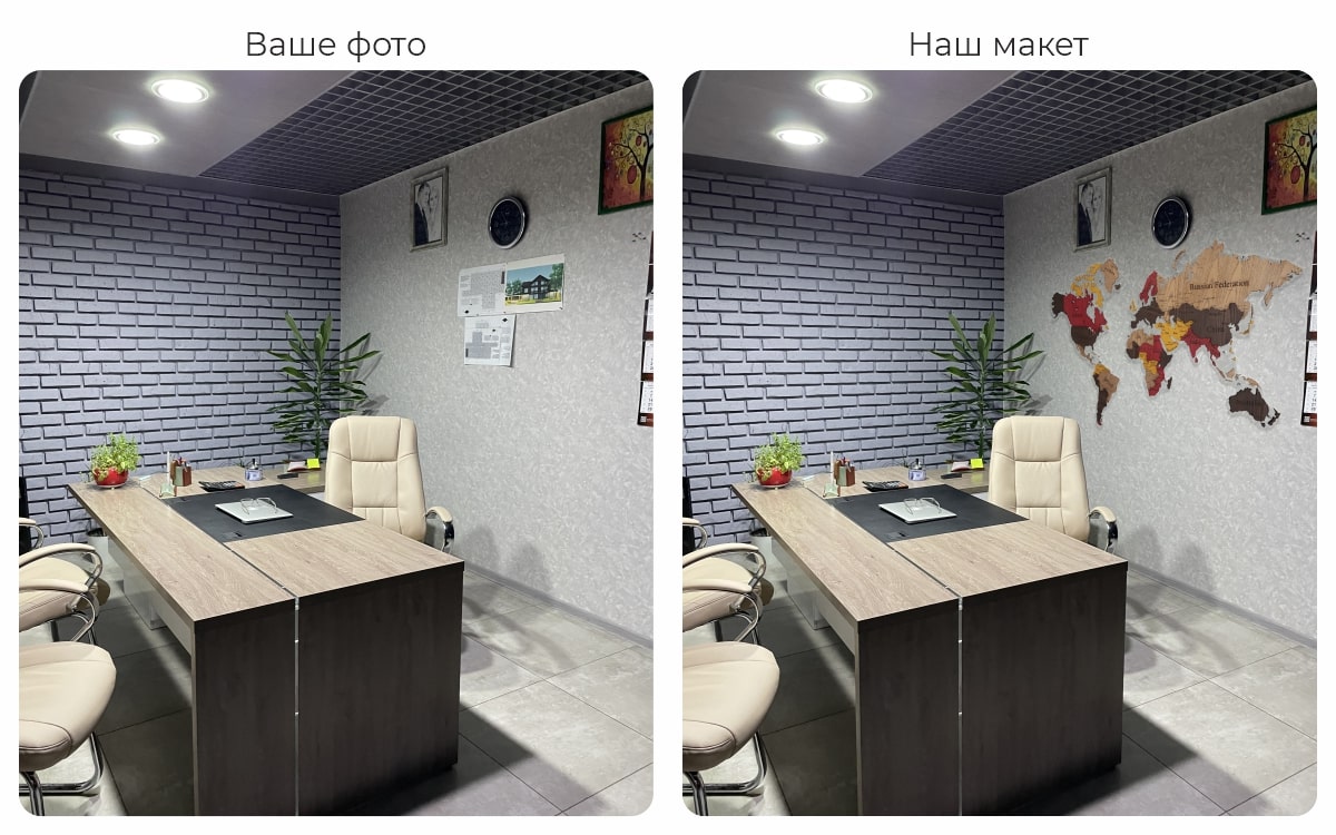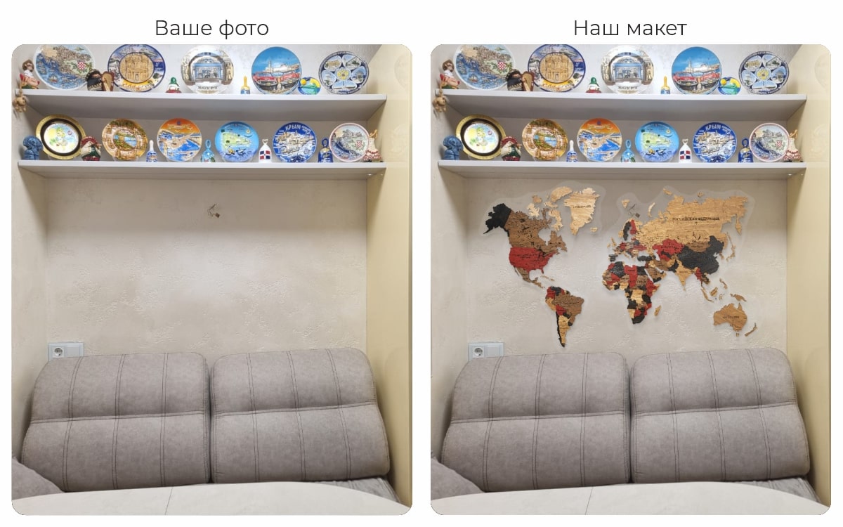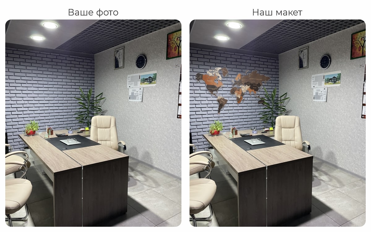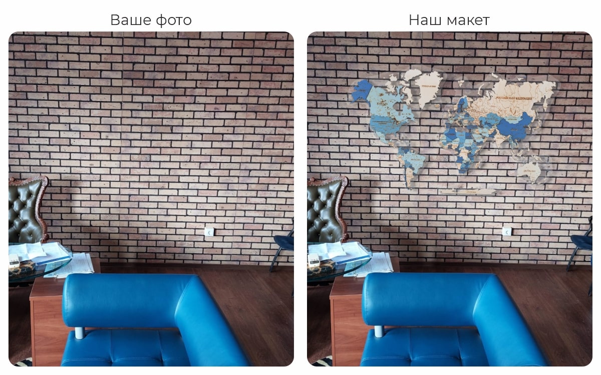 Увидеть, как будет выглядеть карта в Вашем интерьере просто, достаточно прислать нам фото