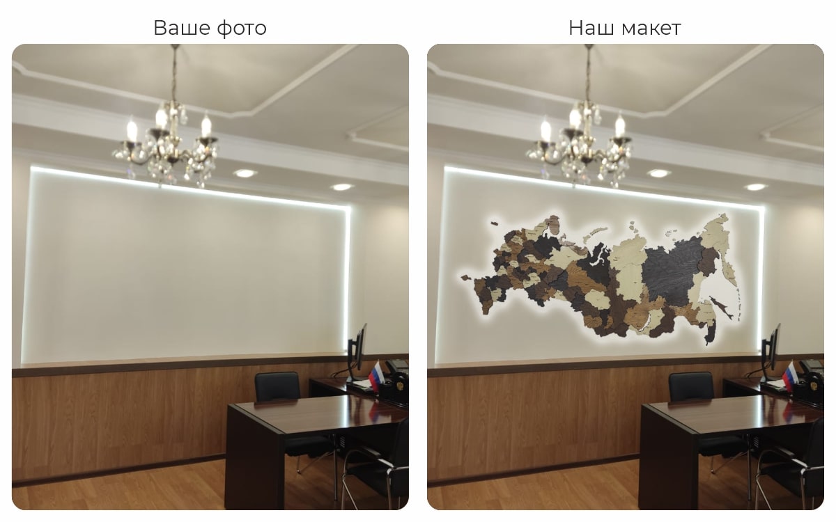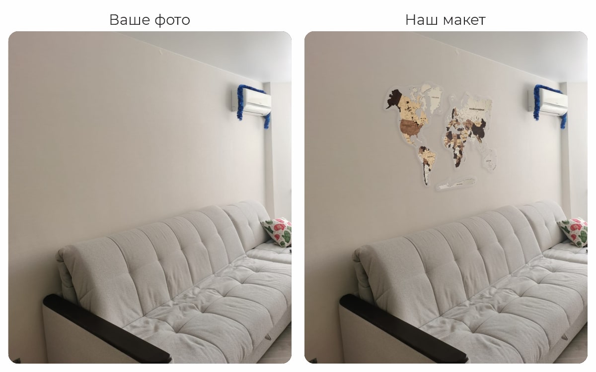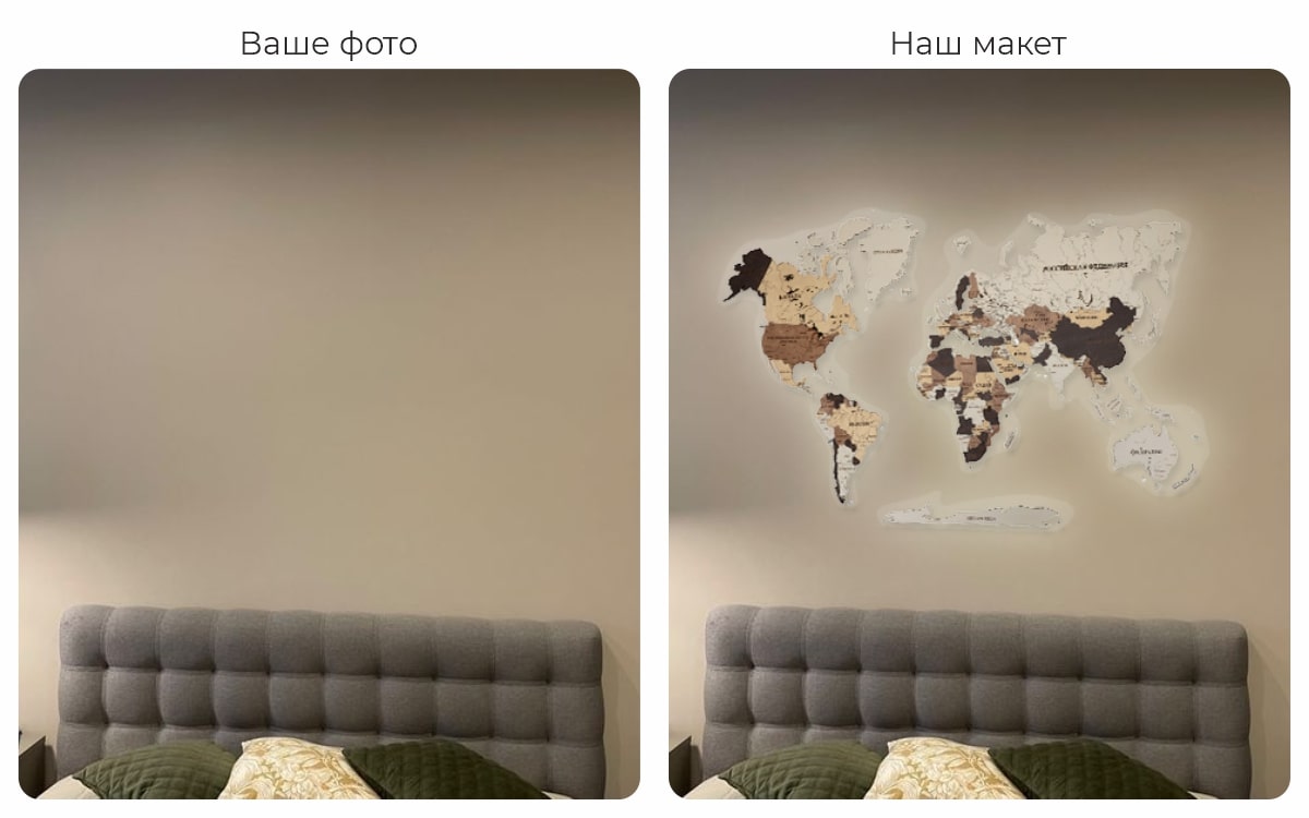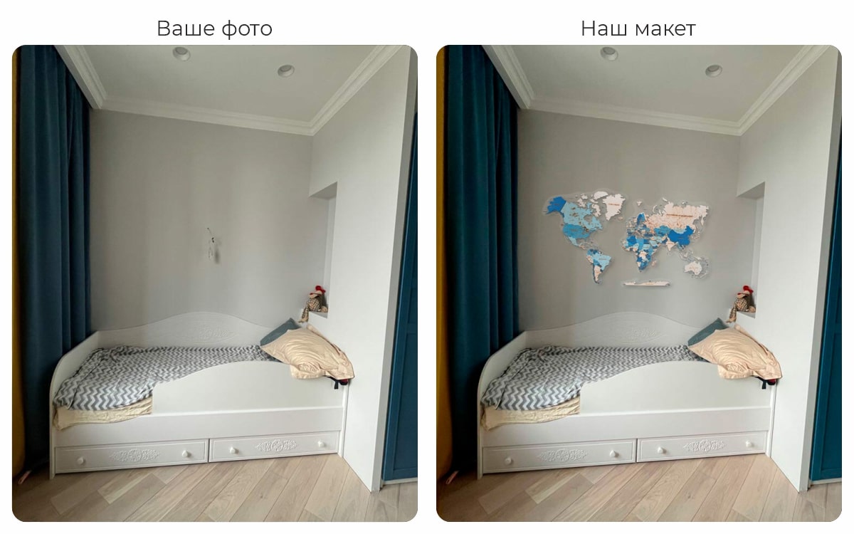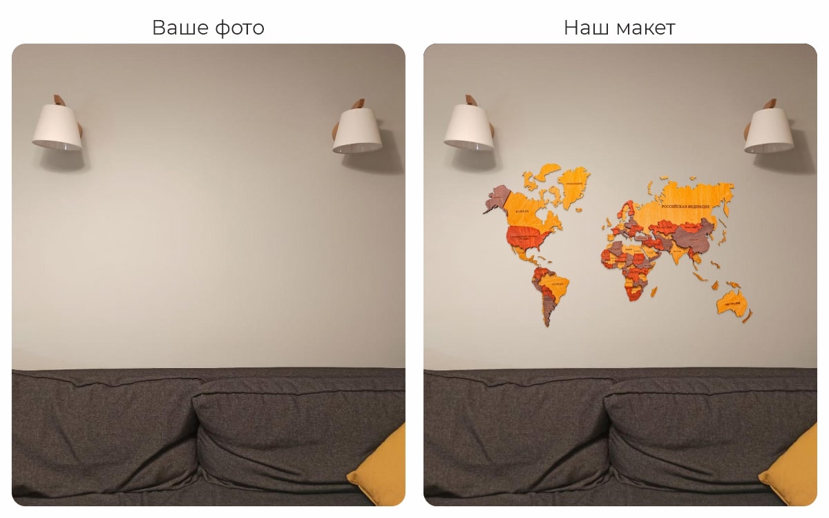 Увидеть, как будет выглядеть карта в Вашем интерьере просто, достаточно прислать нам фото